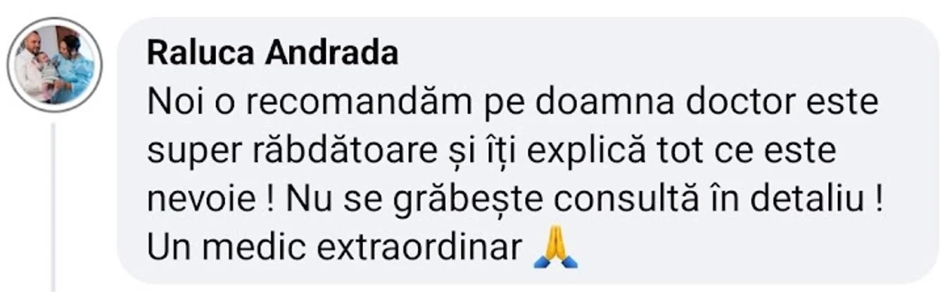 “O recomand cu mult drag pe doamna doctor Chiperi, e profesionista, dedicata pacientilor, empatica si rabdatoare.”